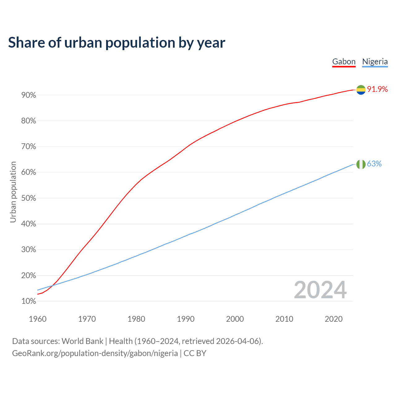 From 2004 to 2024, the share of urban population changed from 82.7% to 91.9% in Gabon and from 46.7% to 63% in Nigeria.