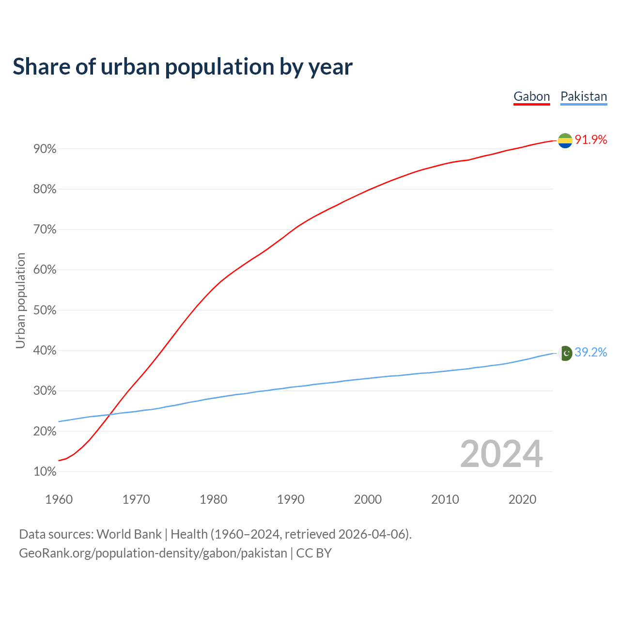From 2004 to 2024, the share of urban population changed from 82.7% to 91.9% in Gabon and from 33.7% to 39.2% in Pakistan.