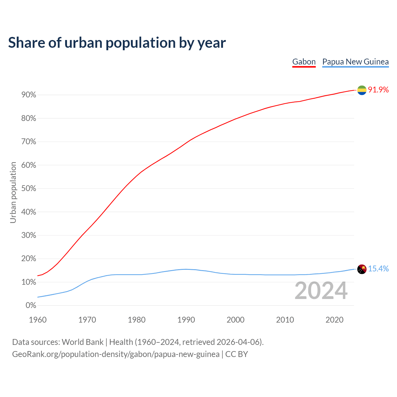 From 2004 to 2024, the share of urban population changed from 82.7% to 91.9% in Gabon and from 13.1% to 15.4% in Papua New Guinea.