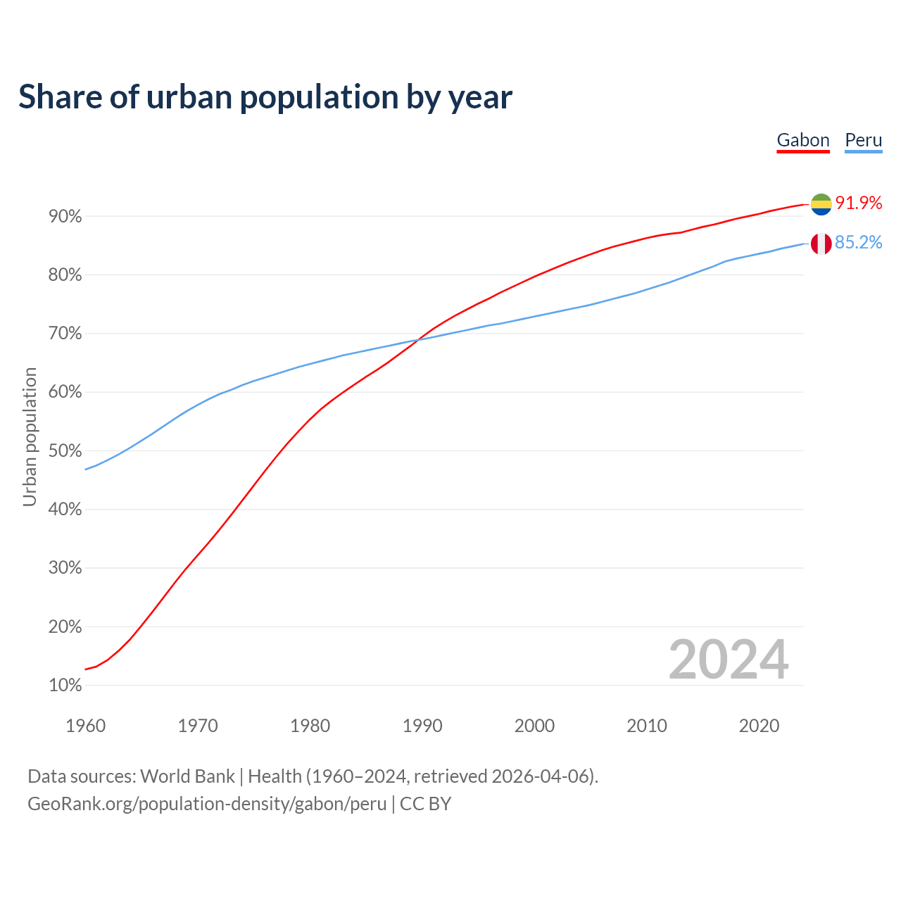 From 2004 to 2024, the share of urban population changed from 82.7% to 91.9% in Gabon and from 74.4% to 85.2% in Peru.