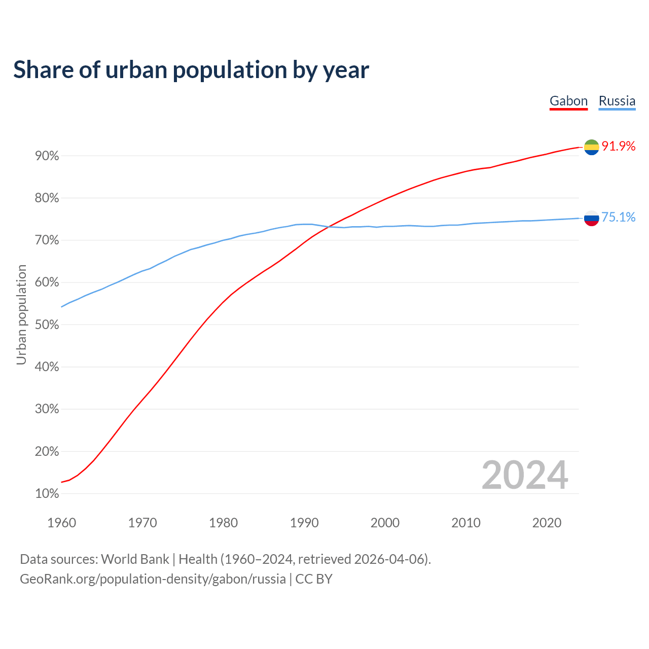 From 2004 to 2024, the share of urban population changed from 82.7% to 91.9% in Gabon and from 73.3% to 75.1% in Russia.