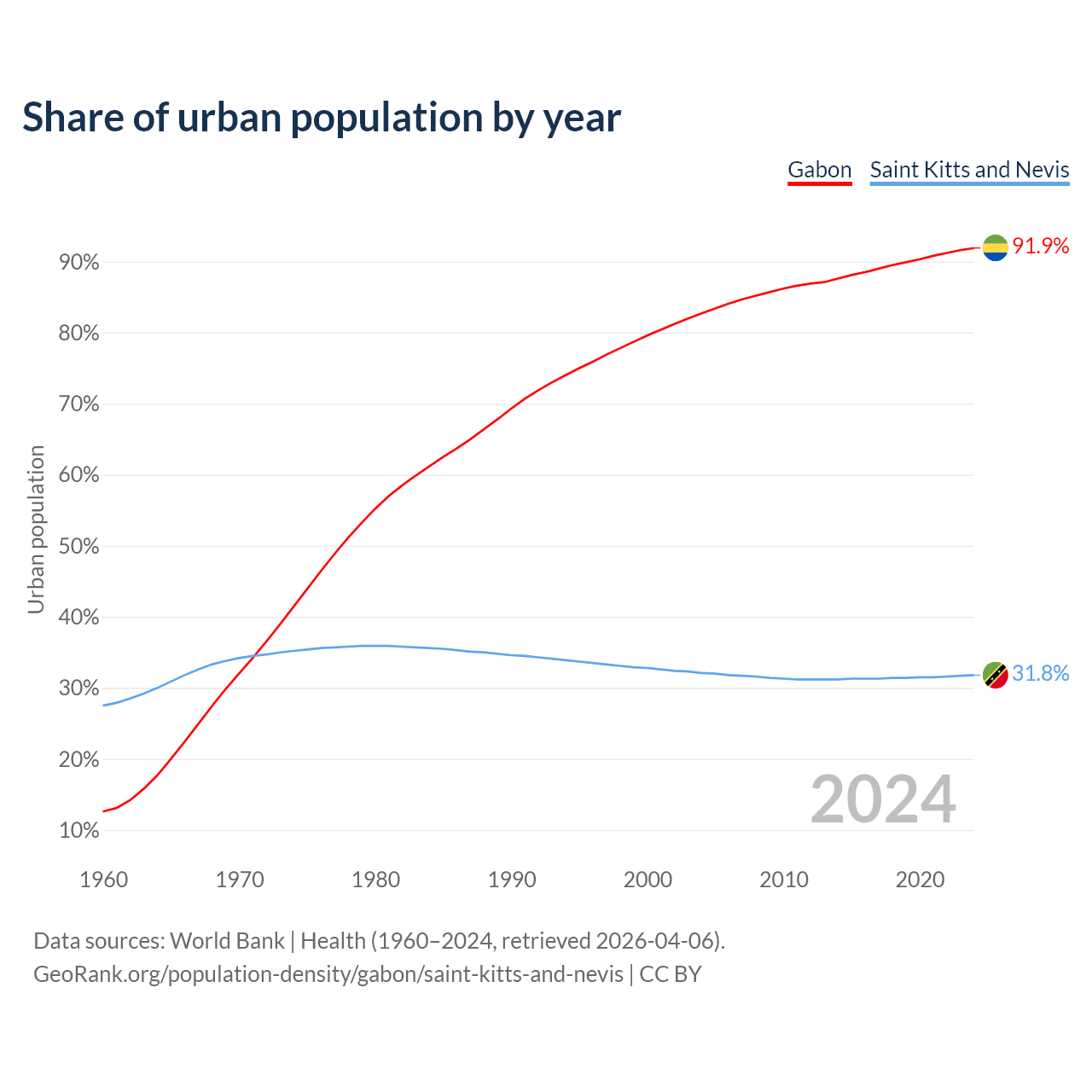 From 2004 to 2024, the share of urban population changed from 82.7% to 91.9% in Gabon and from 32.1% to 31.8% in Saint Kitts and Nevis.