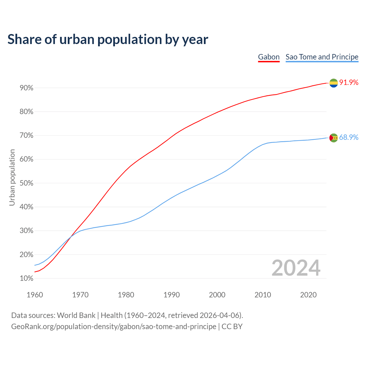 From 2004 to 2024, the share of urban population changed from 82.7% to 91.9% in Gabon and from 57.9% to 68.9% in Sao Tome and Principe.