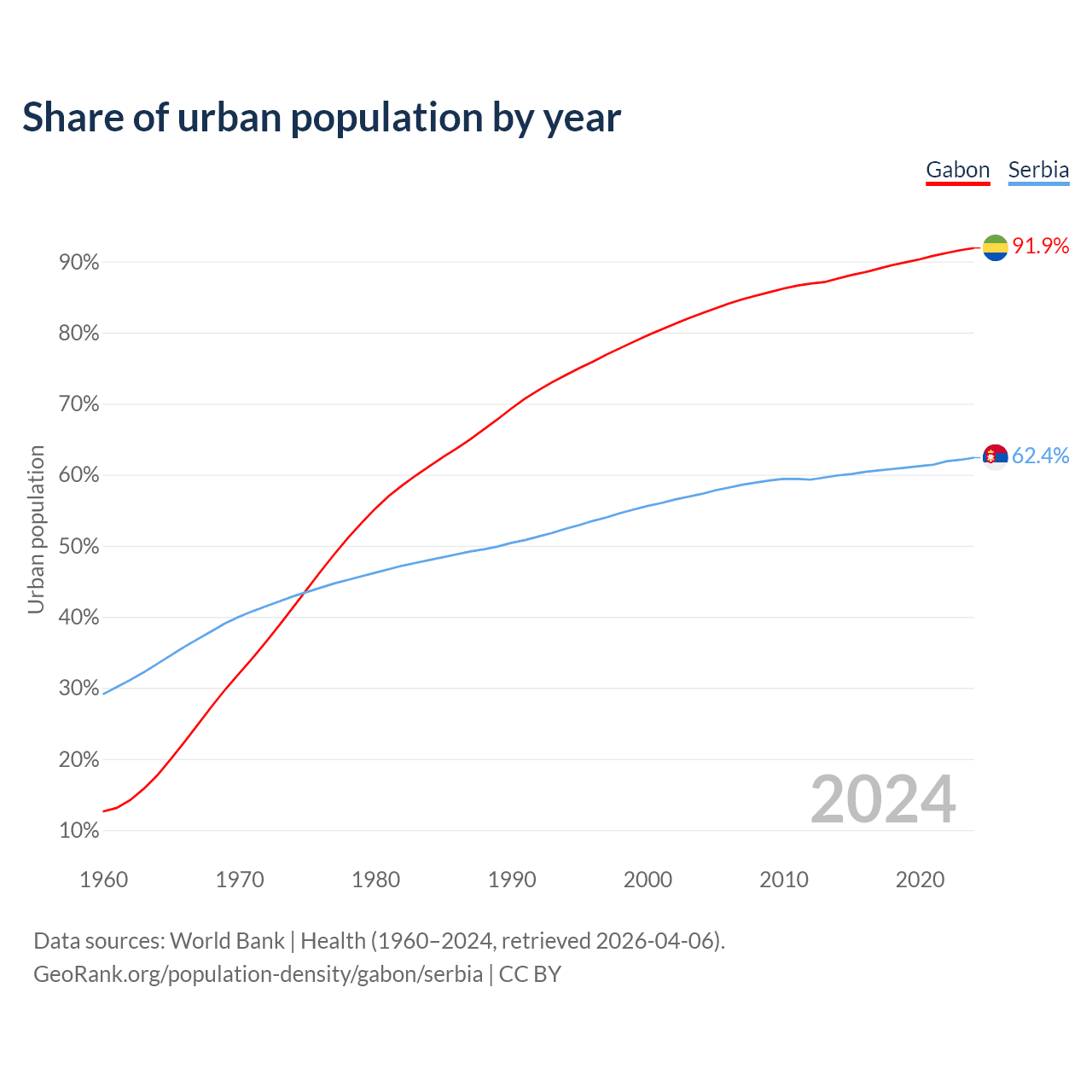 From 2004 to 2024, the share of urban population changed from 82.7% to 91.9% in Gabon and from 57.3% to 62.4% in Serbia.