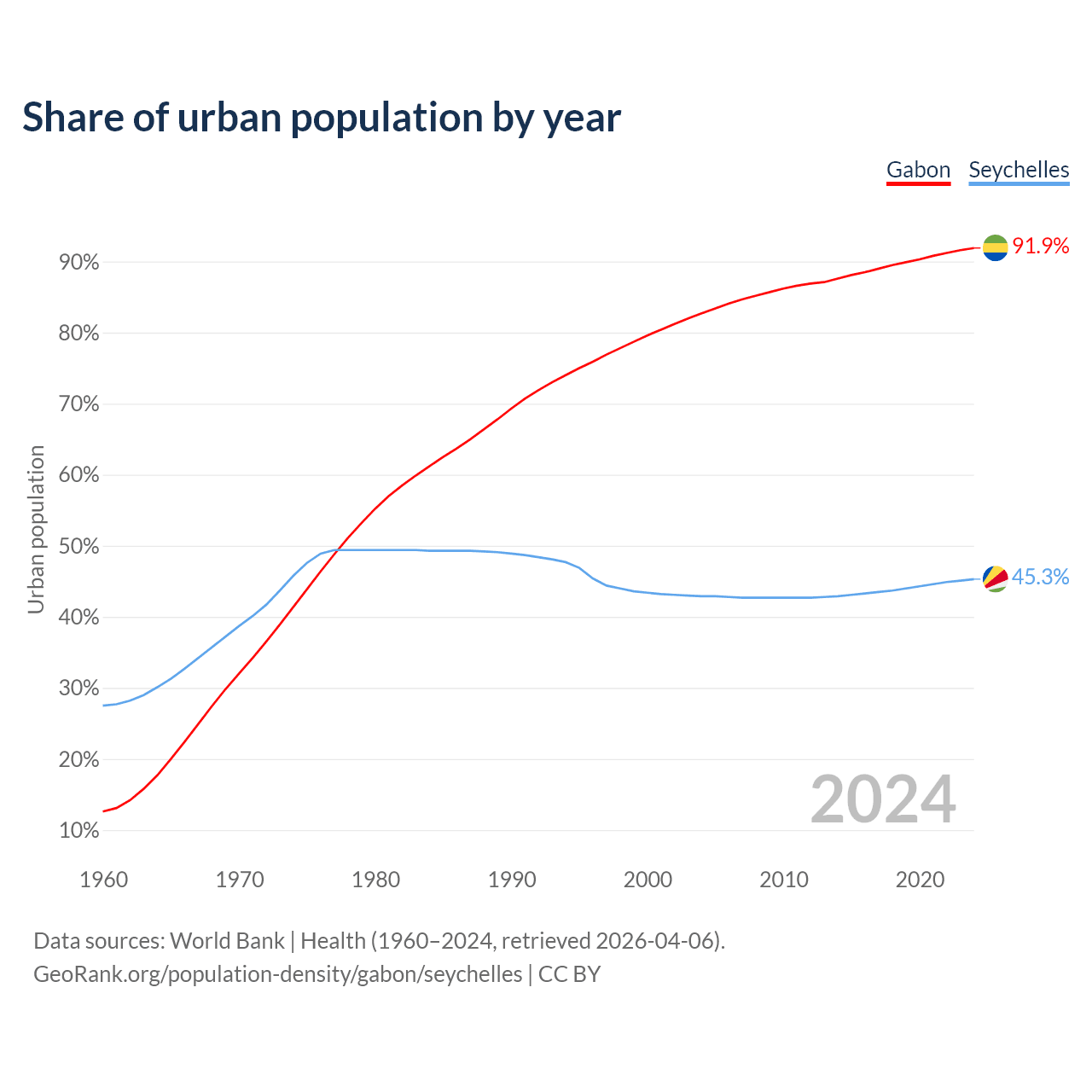 From 2004 to 2024, the share of urban population changed from 82.7% to 91.9% in Gabon and from 42.9% to 45.3% in the Seychelles.
