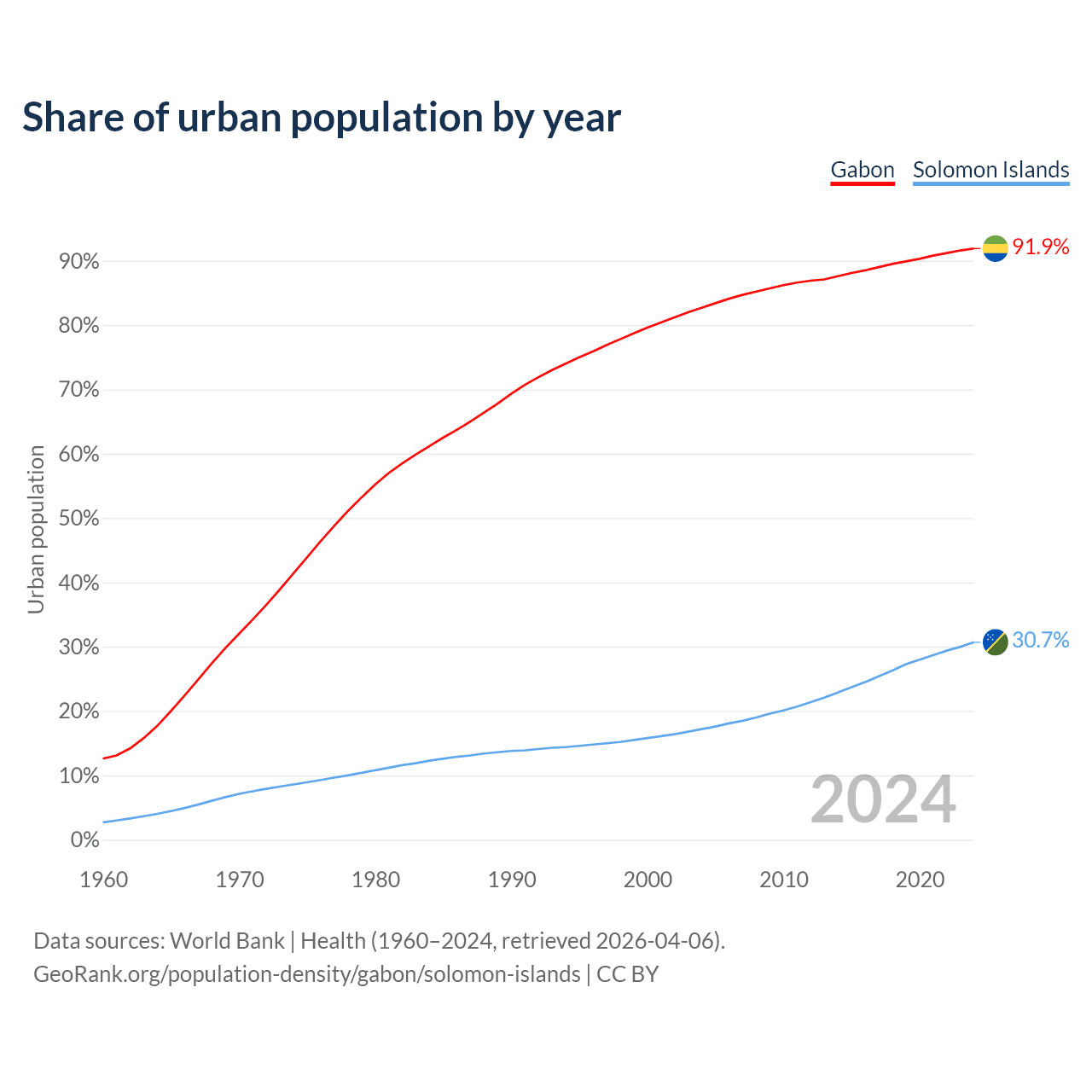 From 2004 to 2024, the share of urban population changed from 82.7% to 91.9% in Gabon and from 17.2% to 30.7% in the Solomon Islands.