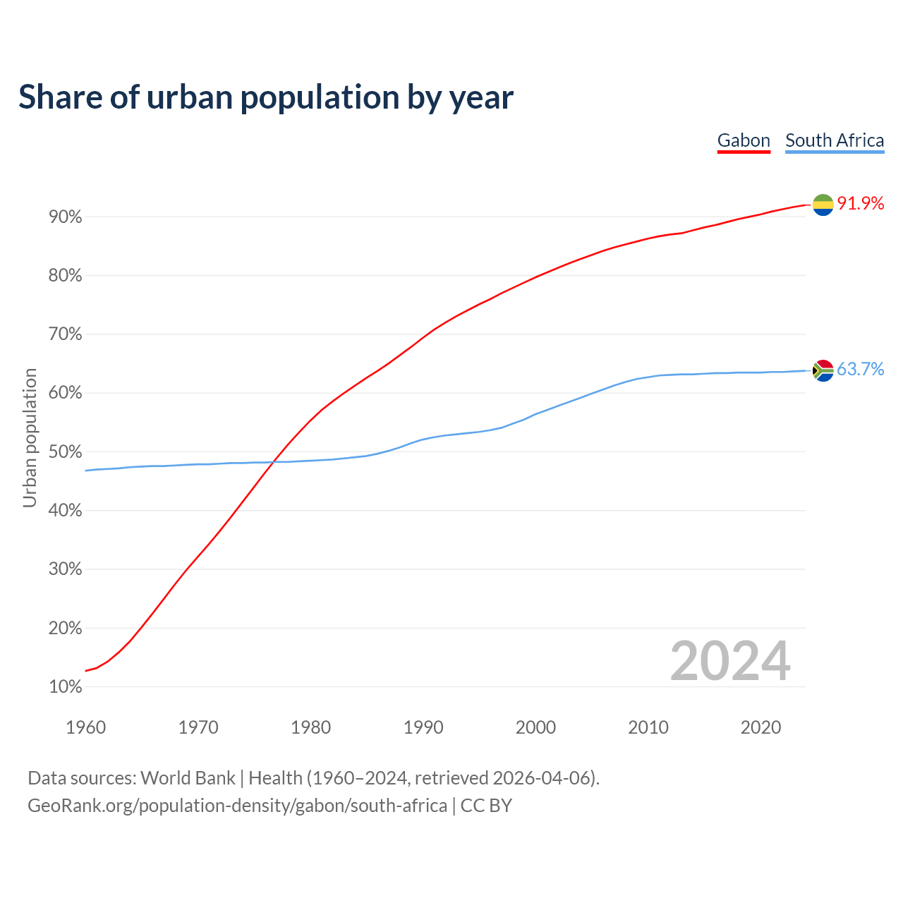 From 2004 to 2024, the share of urban population changed from 82.7% to 91.9% in Gabon and from 59.1% to 63.7% in South Africa.