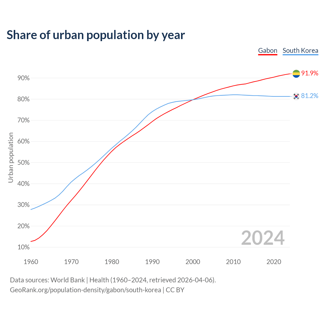 From 2004 to 2024, the share of urban population changed from 82.7% to 91.9% in Gabon and from 81.1% to 81.2% in South Korea.