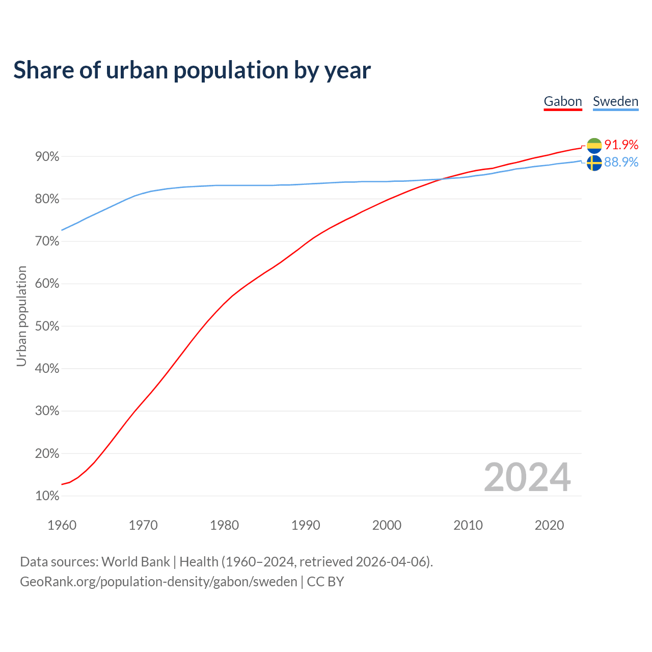From 2004 to 2024, the share of urban population changed from 82.7% to 91.9% in Gabon and from 84.3% to 88.9% in Sweden.