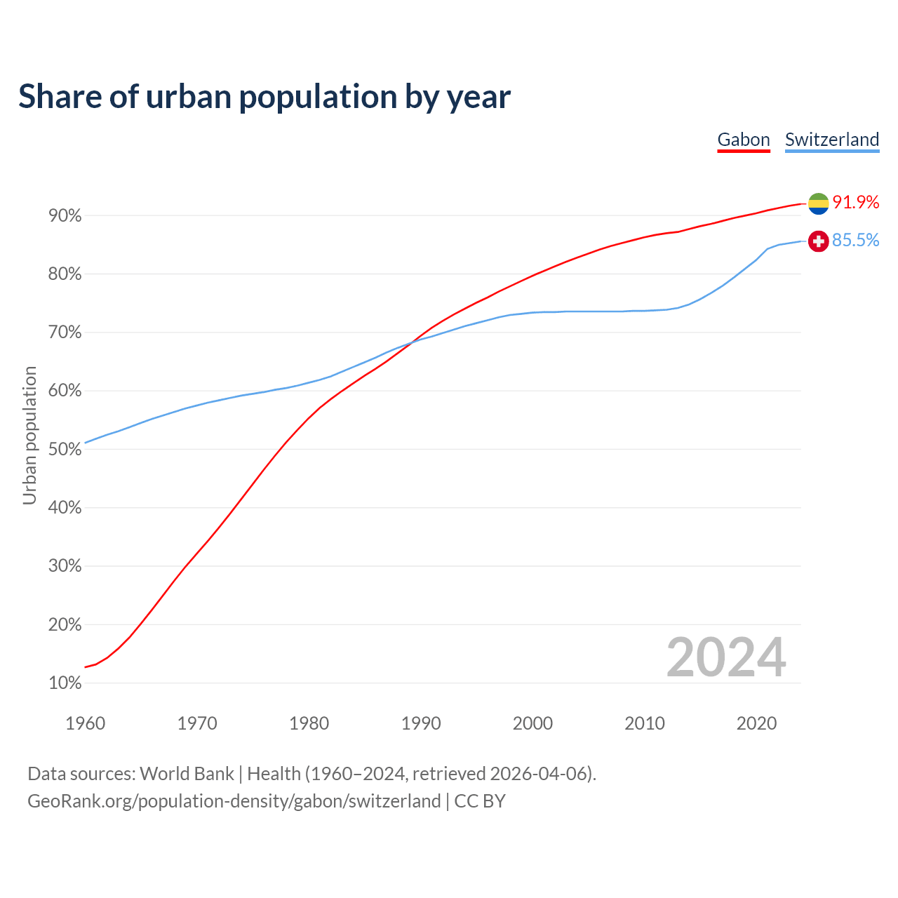 From 2004 to 2024, the share of urban population changed from 82.7% to 91.9% in Gabon and from 73.5% to 85.5% in Switzerland.