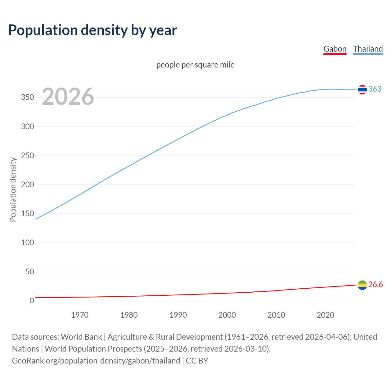 Gabon has a population density of 26.6 people per square mile compared to 363 people in Thailand. Gabon has 1,134,777 sq ft of land per person vs 77,066 sq ft in Thailand. Gabon and Thailand rank 184th and 70th by population density, respectively.