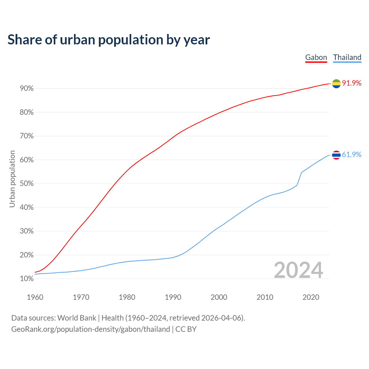 From 2004 to 2024, the share of urban population changed from 82.7% to 91.9% in Gabon and from 36.8% to 61.9% in Thailand.