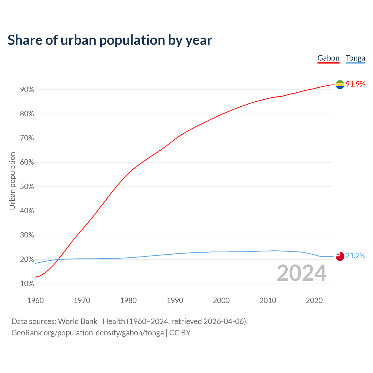 From 2004 to 2024, the share of urban population changed from 82.7% to 91.9% in Gabon and from 23.1% to 21.2% in Tonga.
