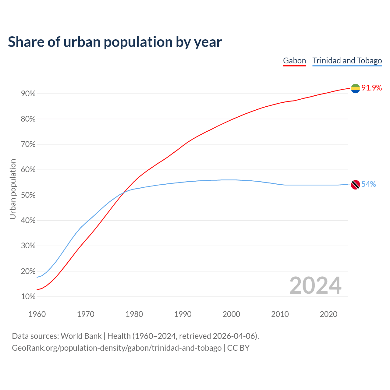From 2004 to 2024, the share of urban population changed from 82.7% to 91.9% in Gabon and from 55.6% to 54% in Trinidad and Tobago.