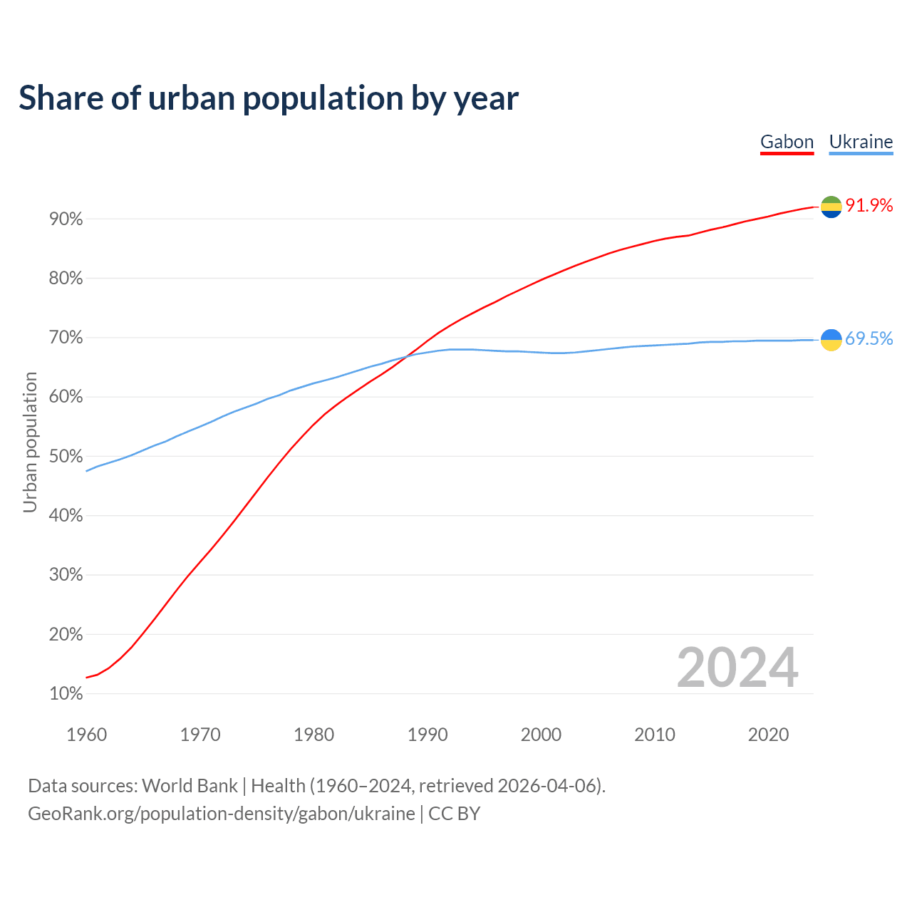 From 2004 to 2024, the share of urban population changed from 82.7% to 91.9% in Gabon and from 67.6% to 69.5% in Ukraine.