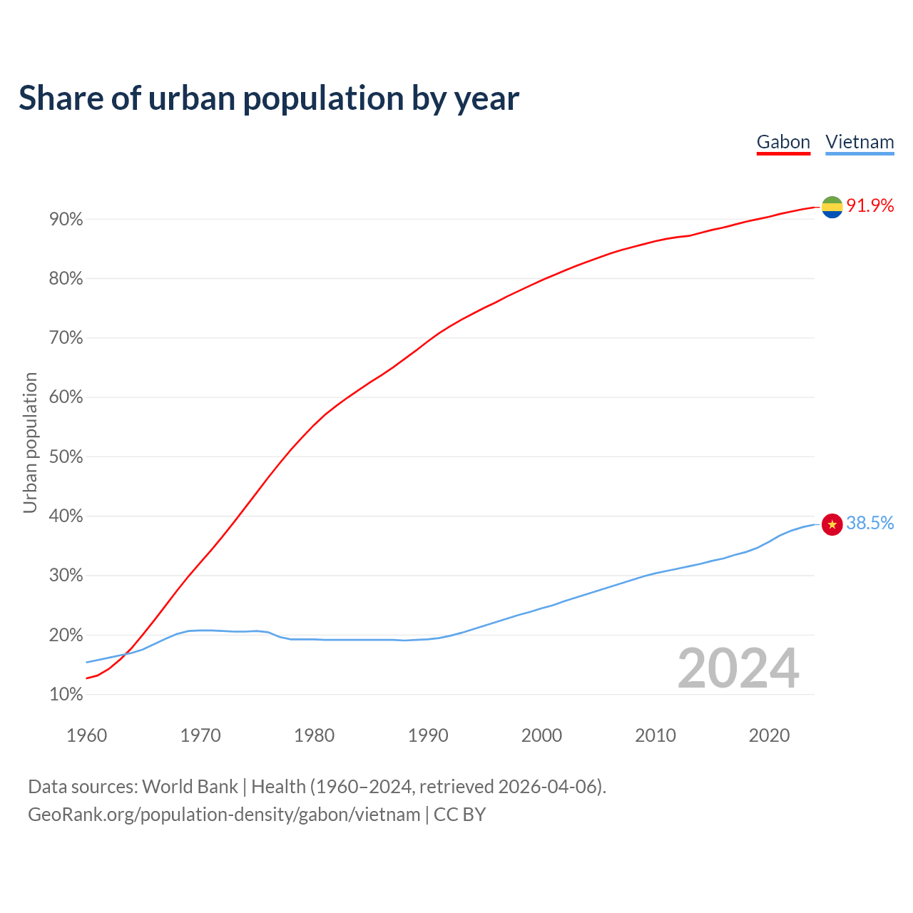 From 2006 to 2026, population density in Gabon increased by 75.6%, compared to a 24.1% growth in Vietnam.