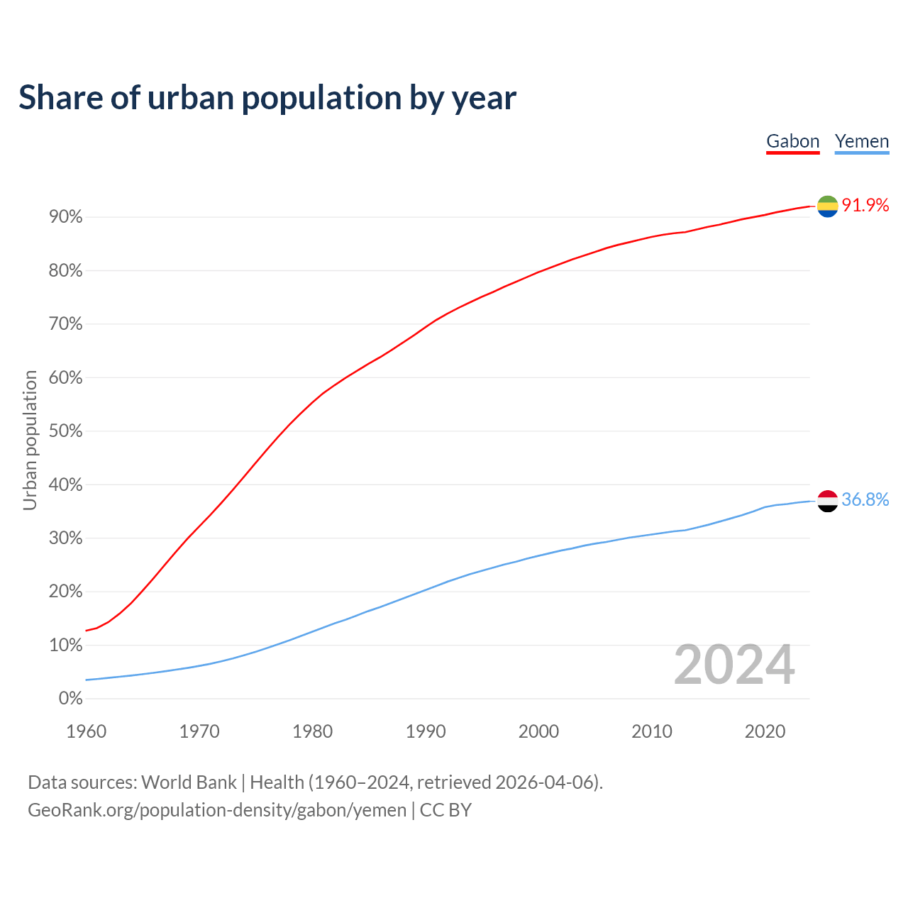 From 2004 to 2024, the share of urban population changed from 82.7% to 91.9% in Gabon and from 28.5% to 36.8% in Yemen.