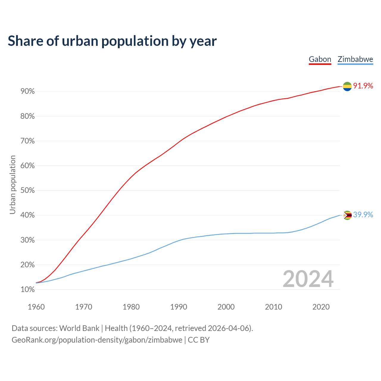 From 2004 to 2024, the share of urban population changed from 82.7% to 91.9% in Gabon and from 32.6% to 39.9% in Zimbabwe.