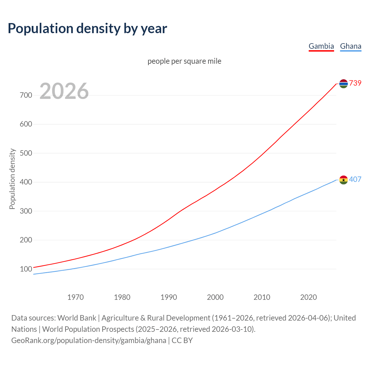 From 2006 to 2026, population density in the Gambia increased by 68.2%, compared to a 55% growth in Ghana.