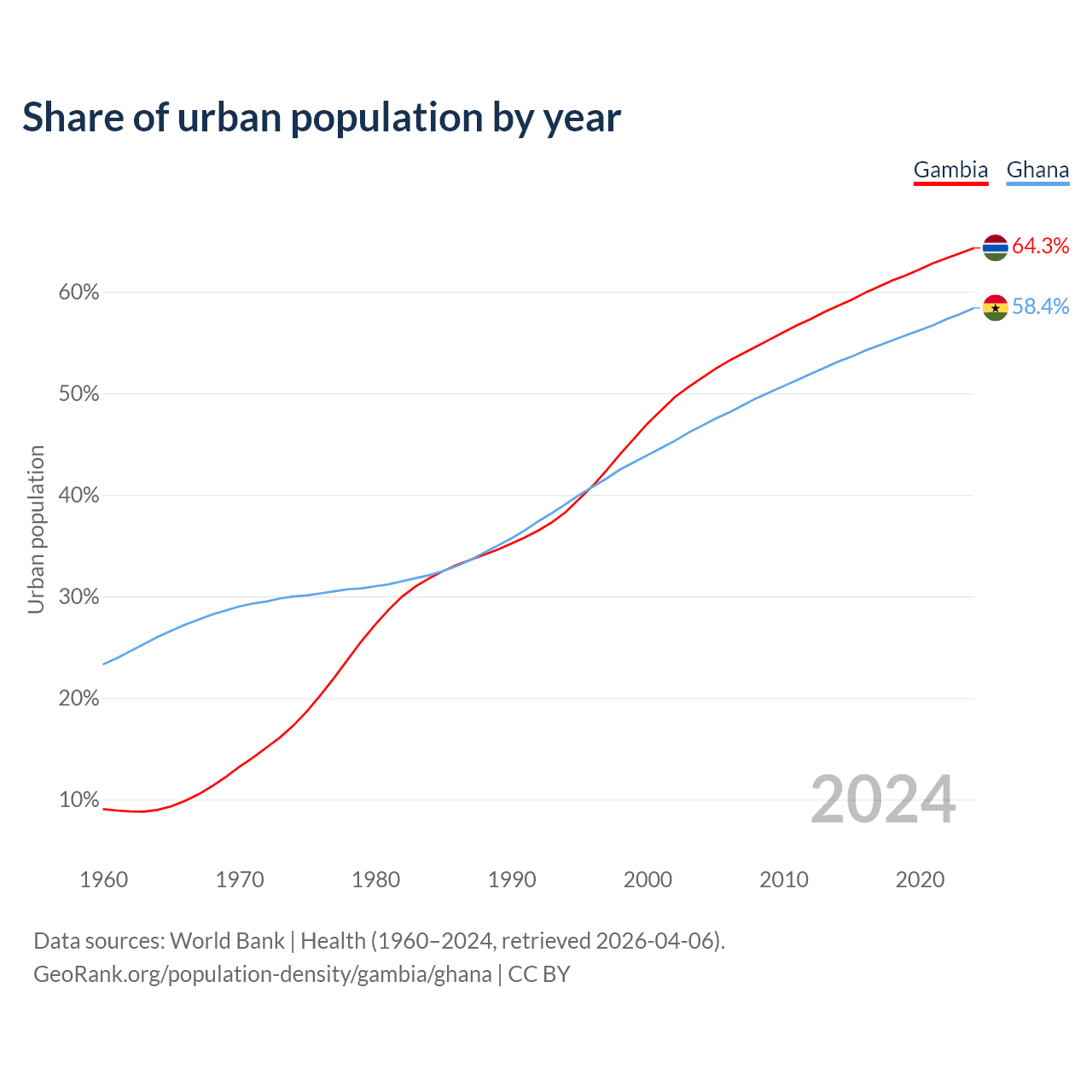 From 2004 to 2024, the share of urban population changed from 51.5% to 64.3% in the Gambia and from 46.8% to 58.4% in Ghana.