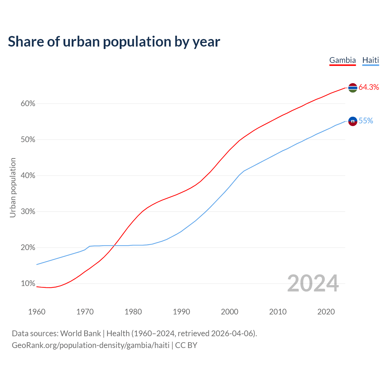 From 2004 to 2024, the share of urban population changed from 51.5% to 64.3% in the Gambia and from 41.9% to 55% in Haiti.