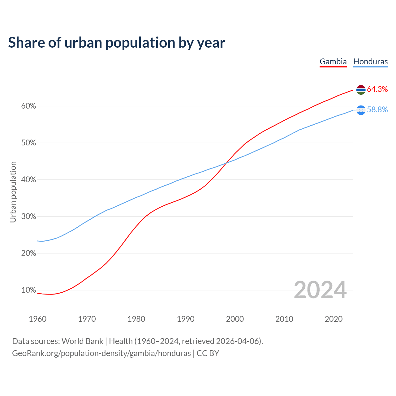 From 2004 to 2024, the share of urban population changed from 51.5% to 64.3% in the Gambia and from 47.6% to 58.8% in Honduras.