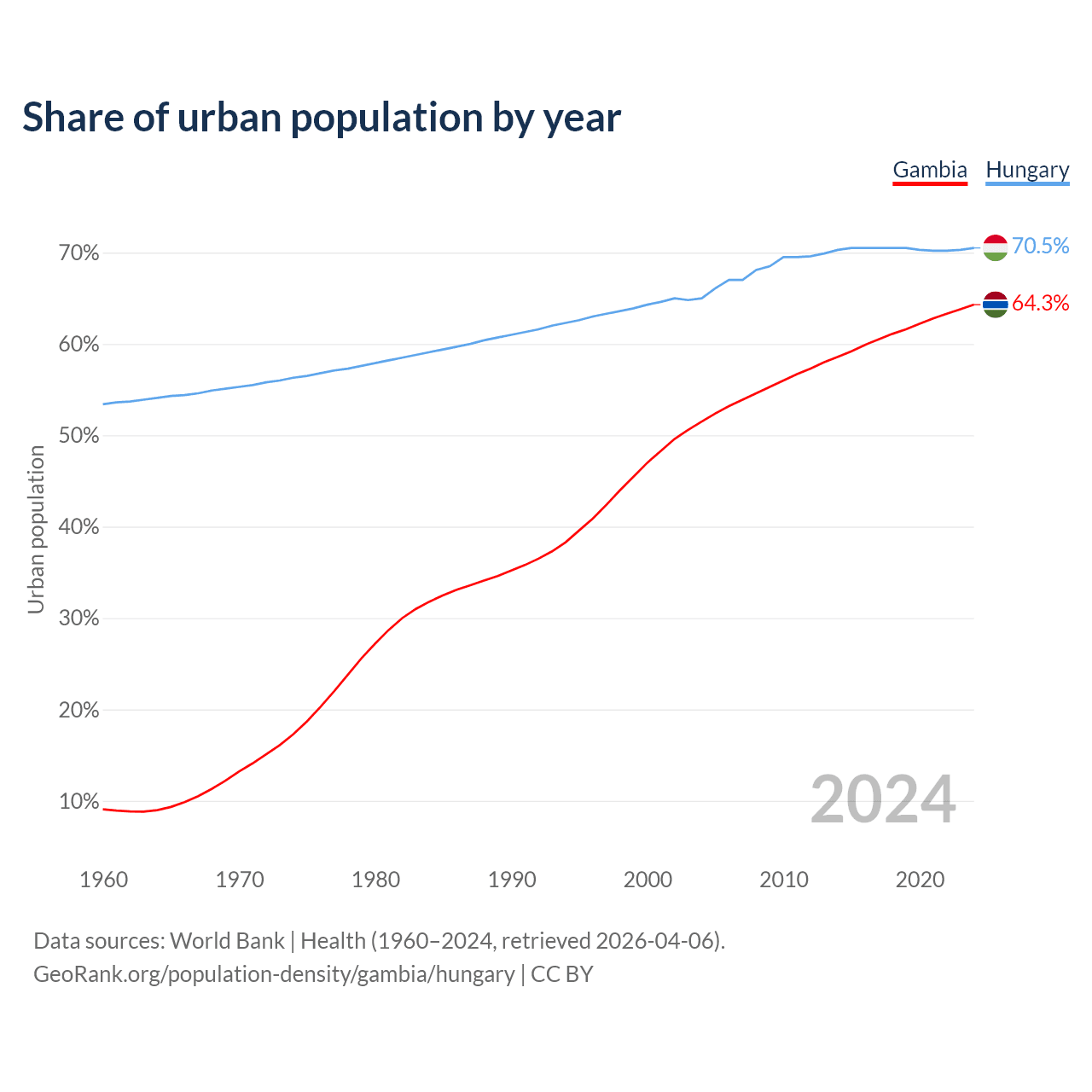 From 2004 to 2024, the share of urban population changed from 51.5% to 64.3% in the Gambia and from 65% to 70.5% in Hungary.