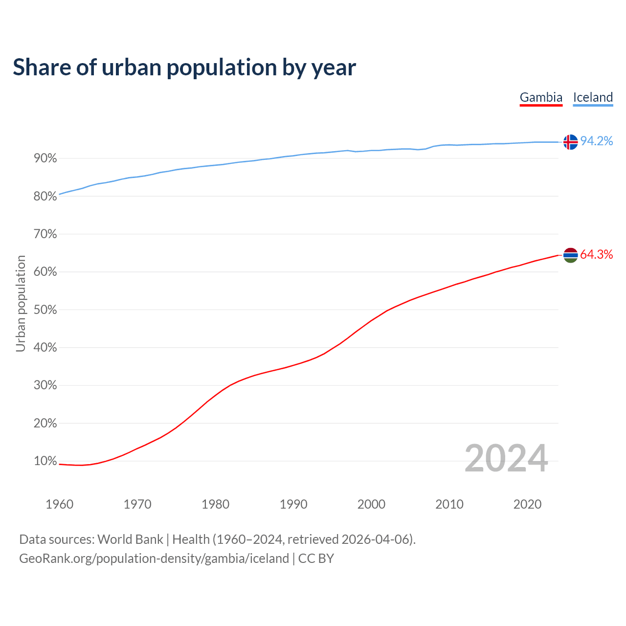 From 2004 to 2024, the share of urban population changed from 51.5% to 64.3% in the Gambia and from 92.4% to 94.2% in Iceland.
