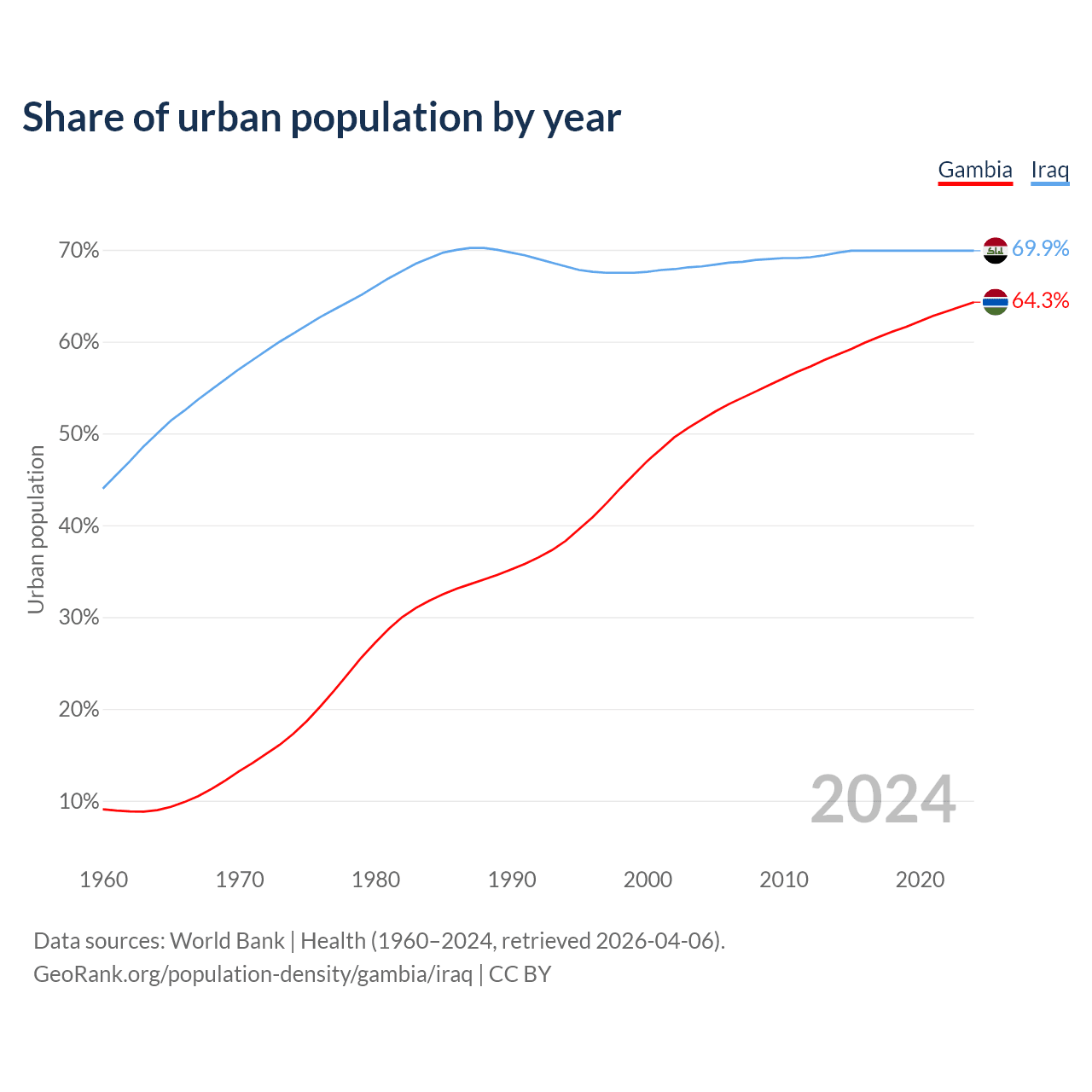 From 2004 to 2024, the share of urban population changed from 51.5% to 64.3% in the Gambia and from 68.2% to 69.9% in Iraq.