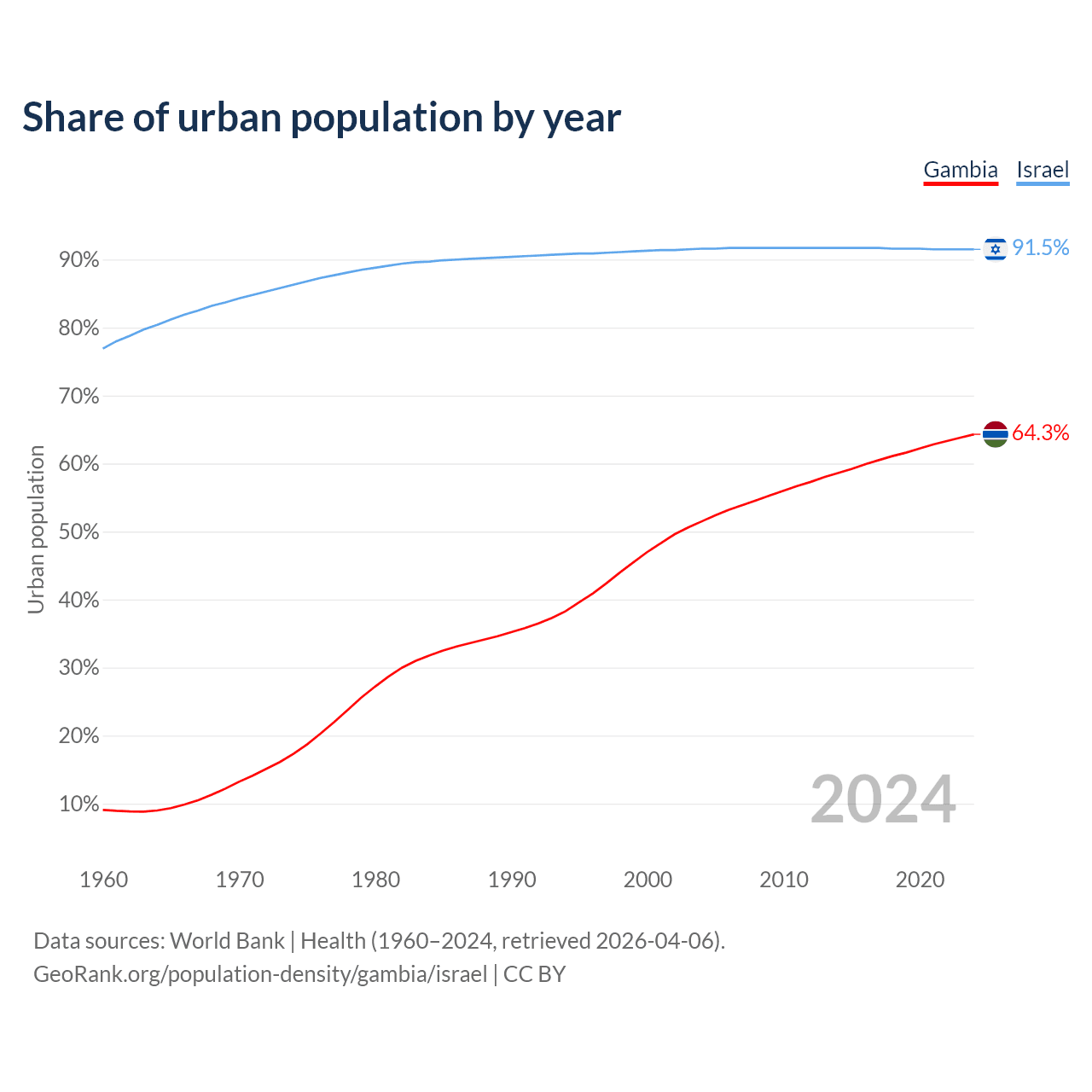 From 2004 to 2024, the share of urban population changed from 51.5% to 64.3% in the Gambia and from 91.6% to 91.5% in Israel.