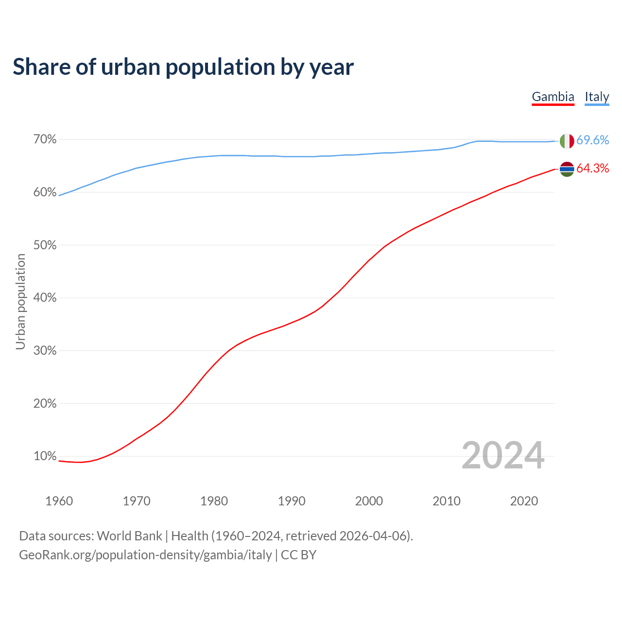From 2004 to 2024, the share of urban population changed from 51.5% to 64.3% in the Gambia and from 67.5% to 69.6% in Italy.