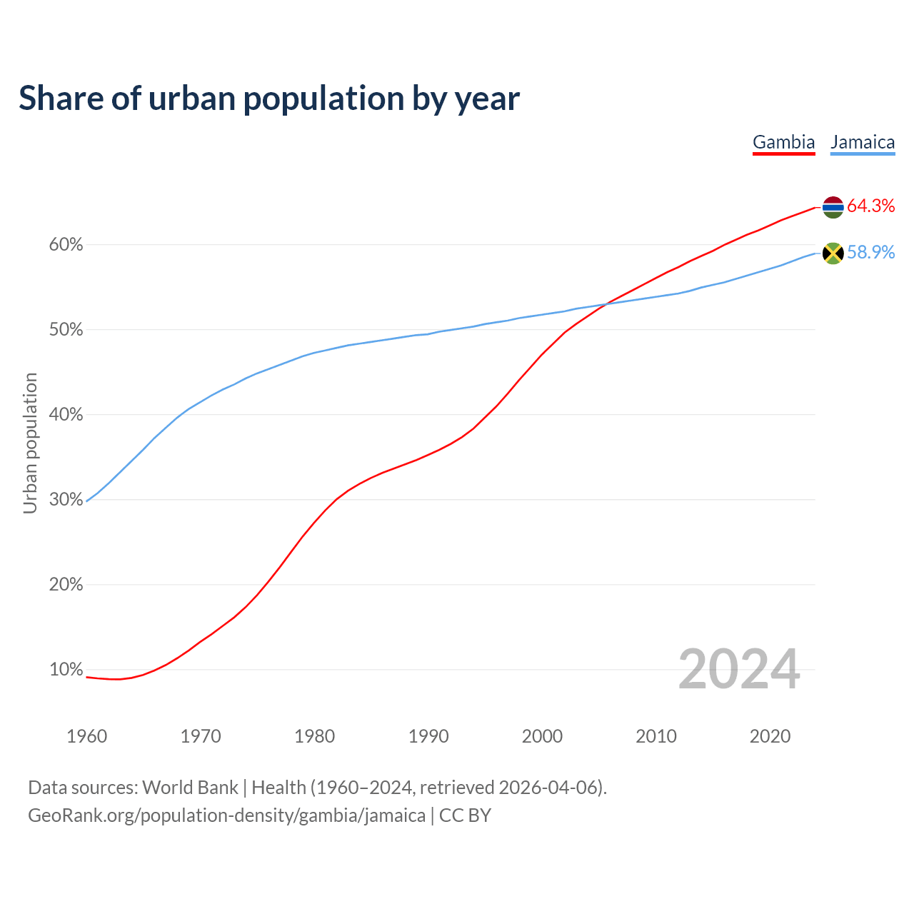 From 2004 to 2024, the share of urban population changed from 51.5% to 64.3% in the Gambia and from 52.6% to 58.9% in Jamaica.
