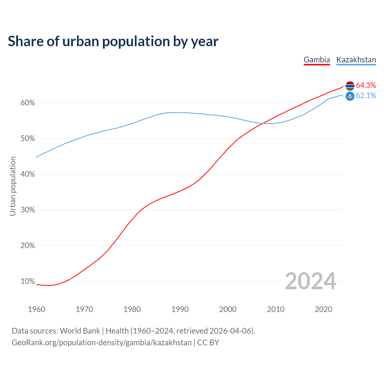 From 2004 to 2024, the share of urban population changed from 51.5% to 64.3% in the Gambia and from 54.9% to 62.1% in Kazakhstan.