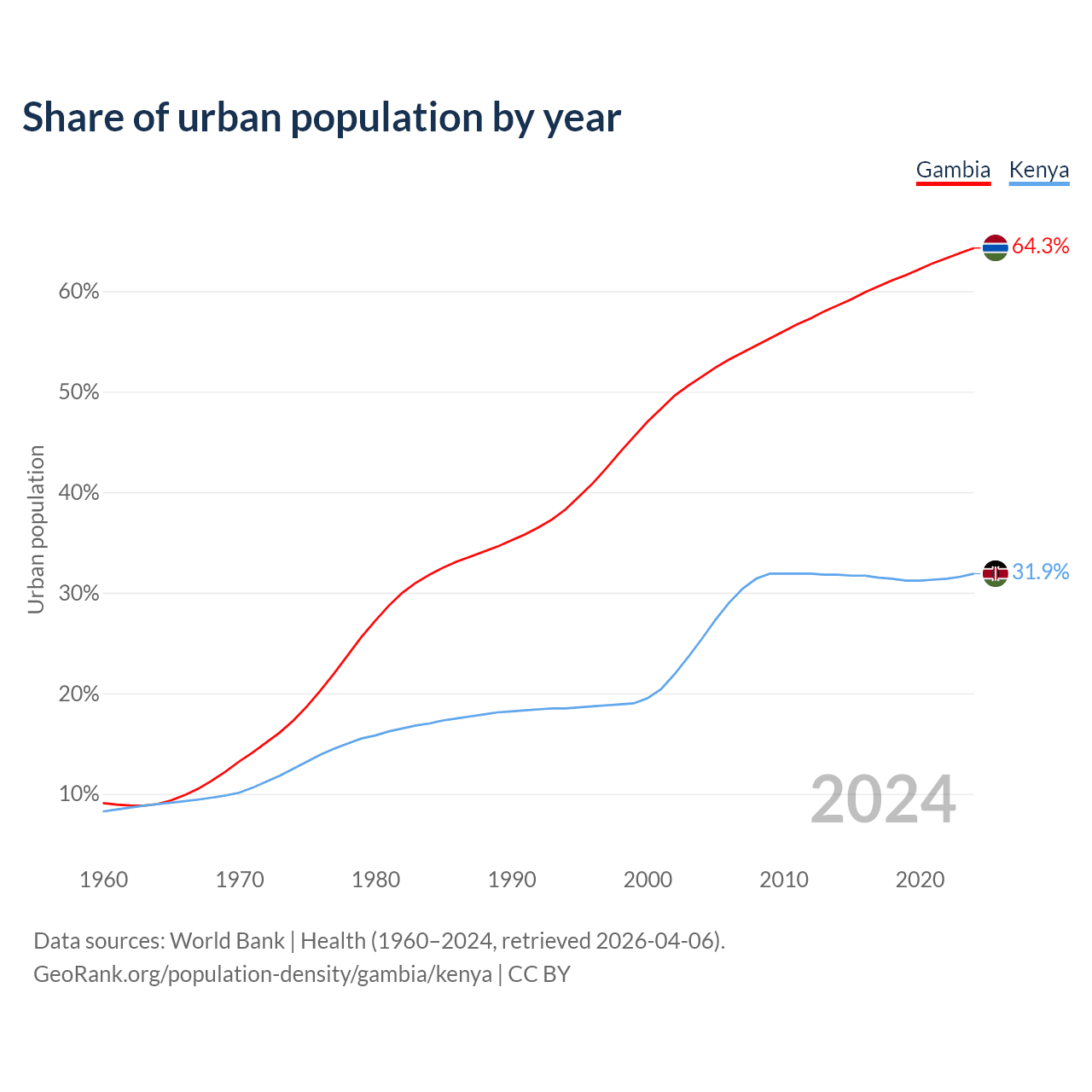 From 2004 to 2024, the share of urban population changed from 51.5% to 64.3% in the Gambia and from 25.4% to 31.9% in Kenya.