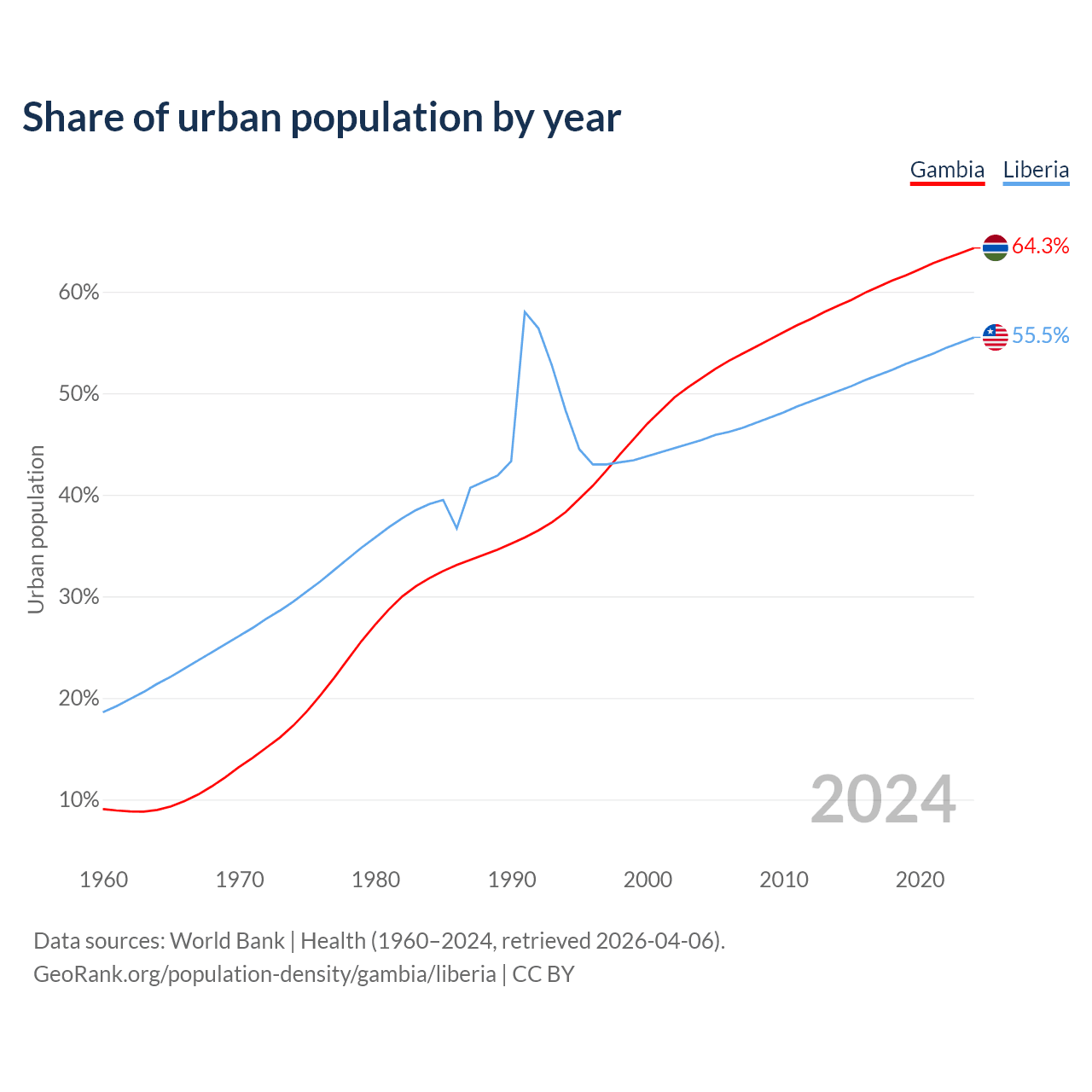 From 2004 to 2024, the share of urban population changed from 51.5% to 64.3% in the Gambia and from 45.4% to 55.5% in Liberia.