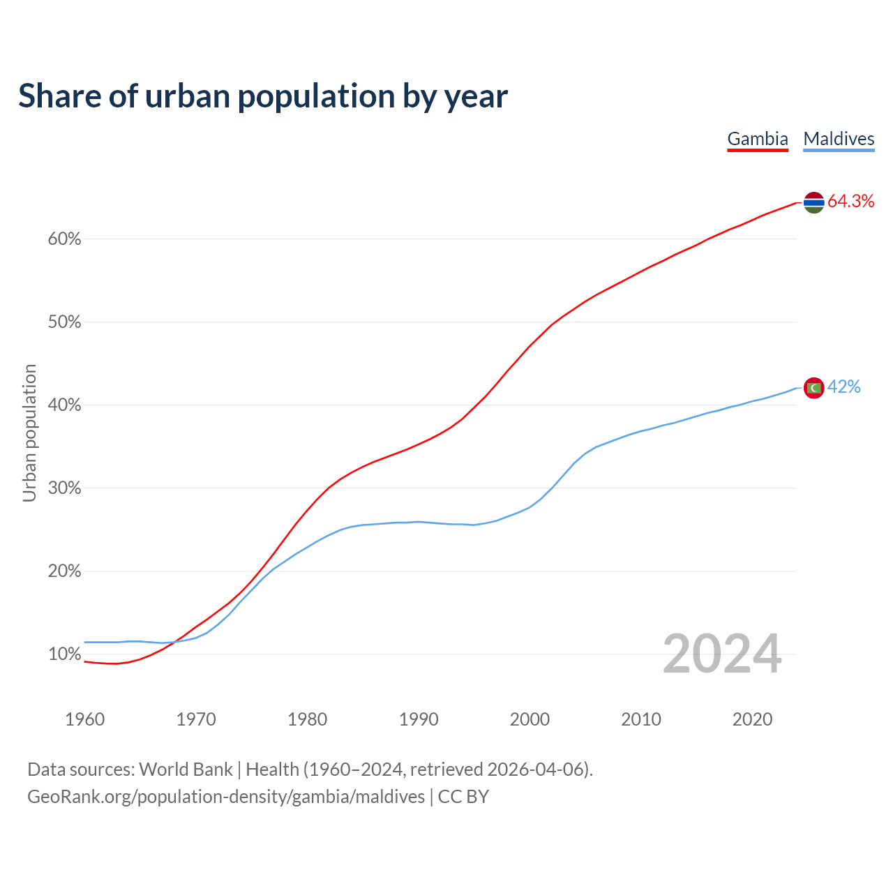 From 2004 to 2024, the share of urban population changed from 51.5% to 64.3% in the Gambia and from 32.9% to 42% in Maldives.