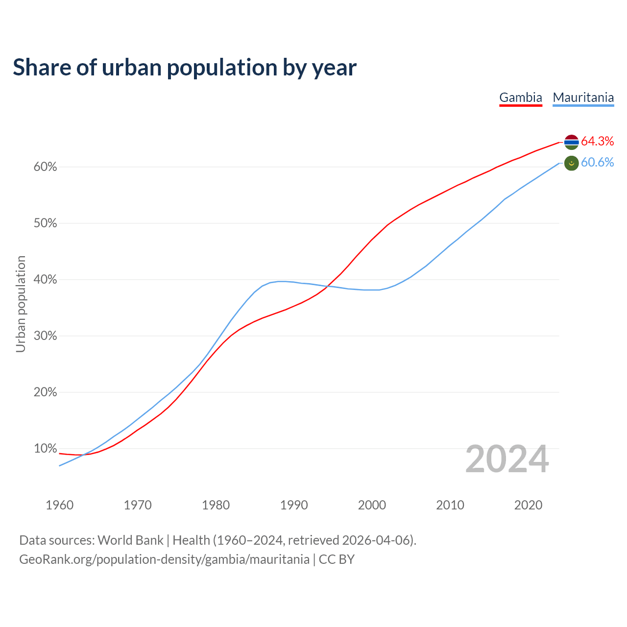 From 2004 to 2024, the share of urban population changed from 51.5% to 64.3% in the Gambia and from 39.6% to 60.6% in Mauritania.