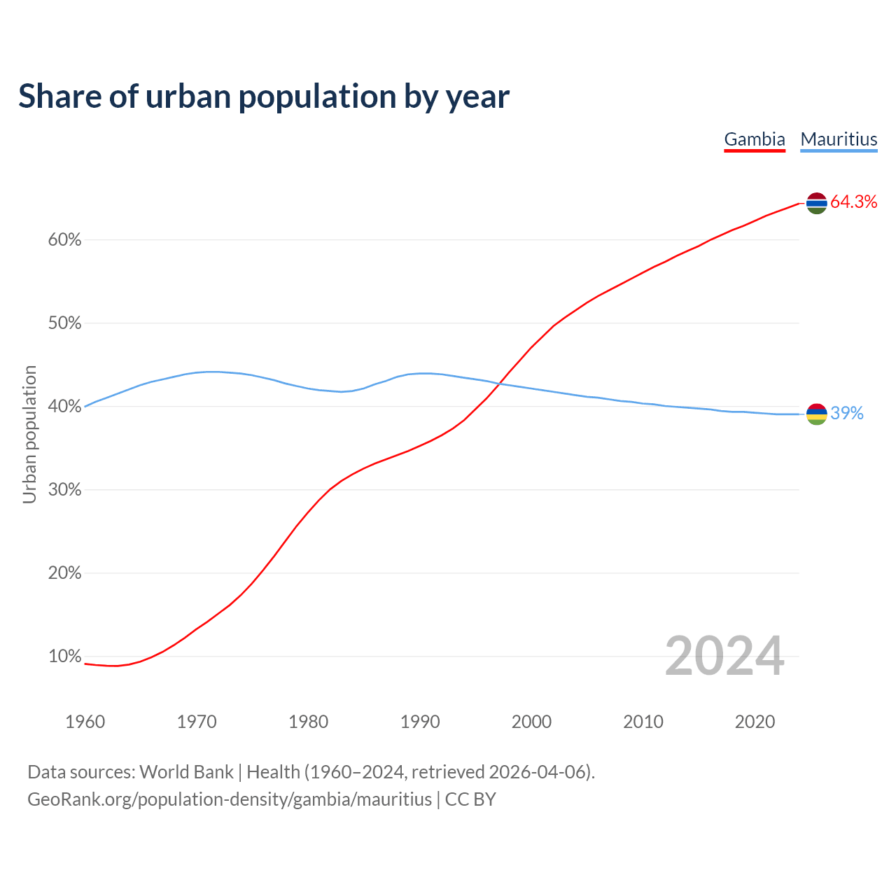 From 2004 to 2024, the share of urban population changed from 51.5% to 64.3% in the Gambia and from 41.3% to 39% in Mauritius.
