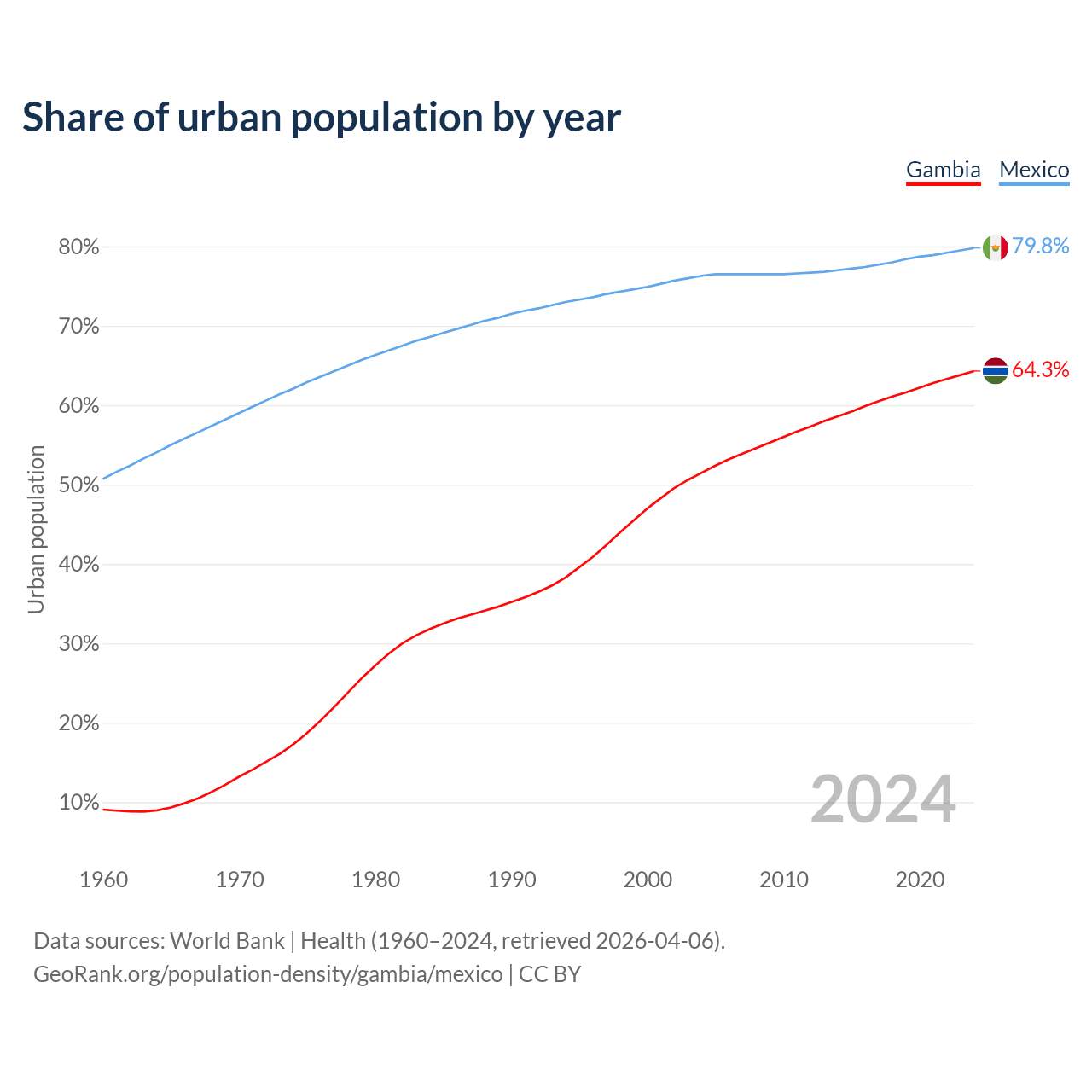 From 2004 to 2024, the share of urban population changed from 51.5% to 64.3% in the Gambia and from 76.3% to 79.8% in Mexico.