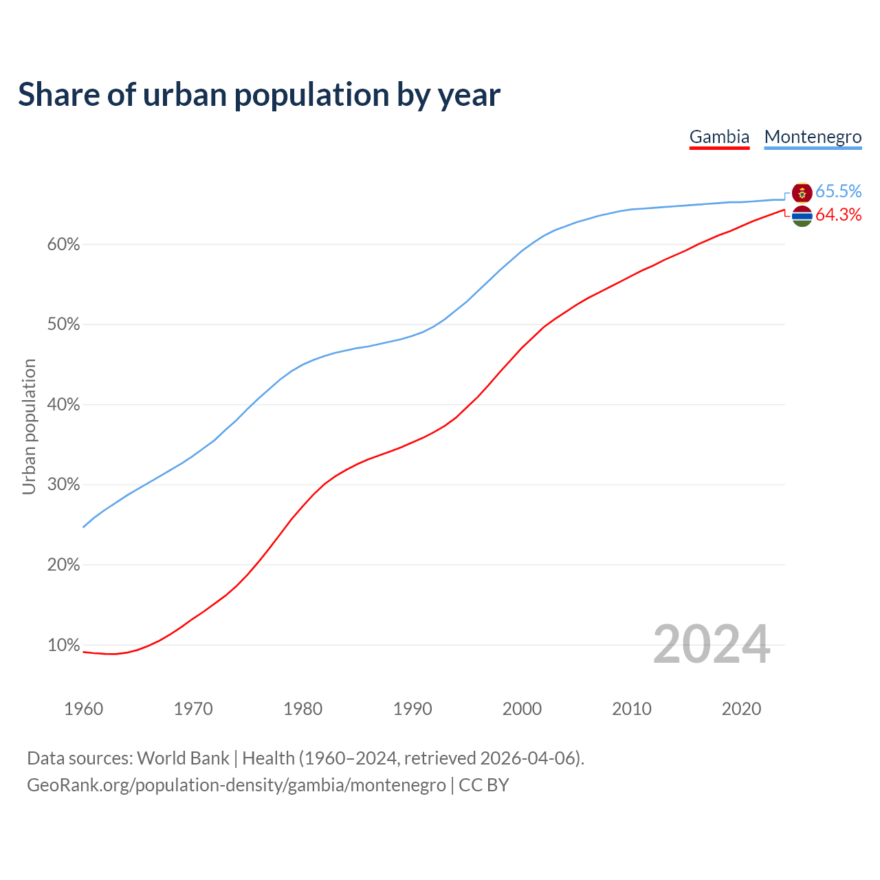 From 2004 to 2024, the share of urban population changed from 51.5% to 64.3% in the Gambia and from 62.2% to 65.5% in Montenegro.