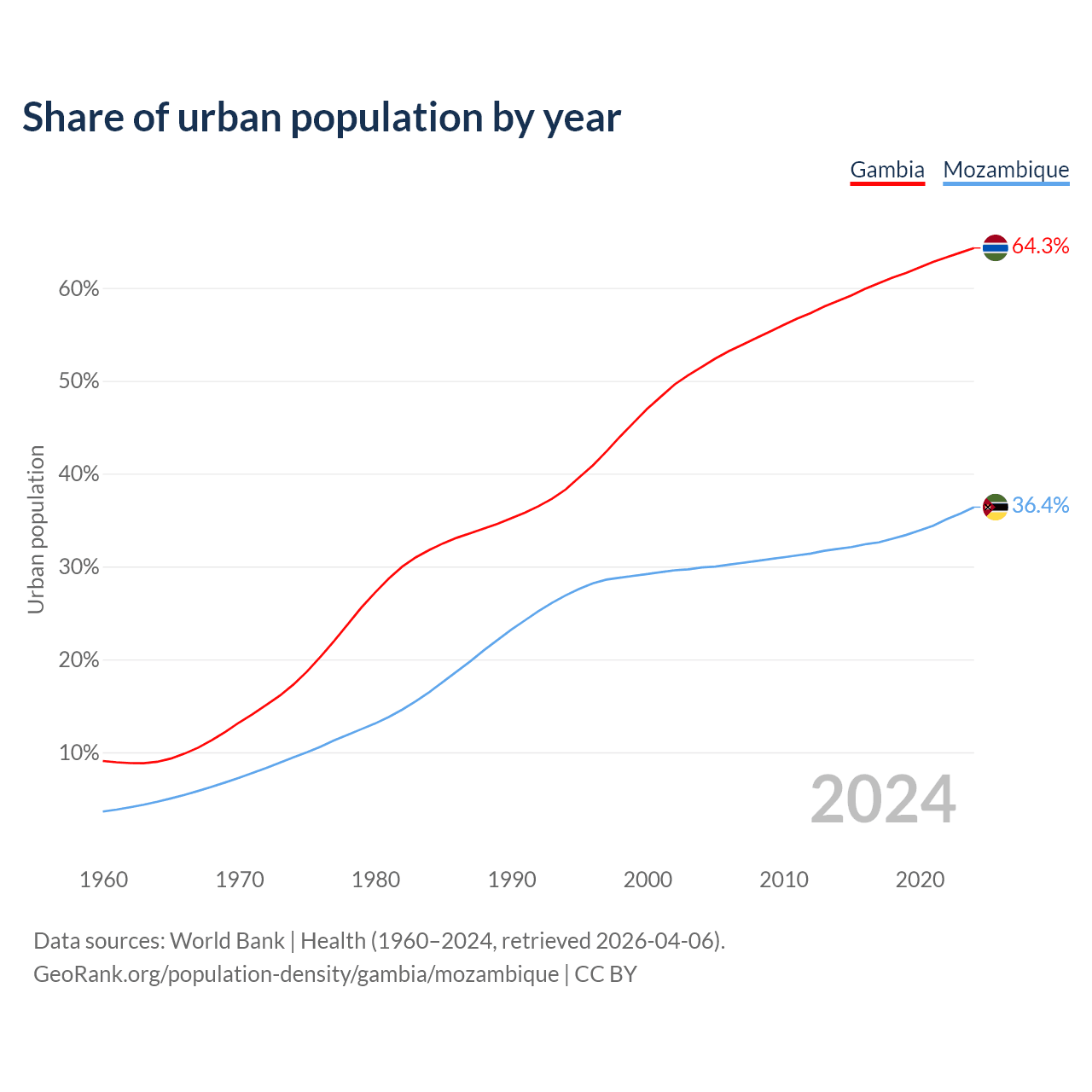 From 2004 to 2024, the share of urban population changed from 51.5% to 64.3% in the Gambia and from 29.9% to 36.4% in Mozambique.