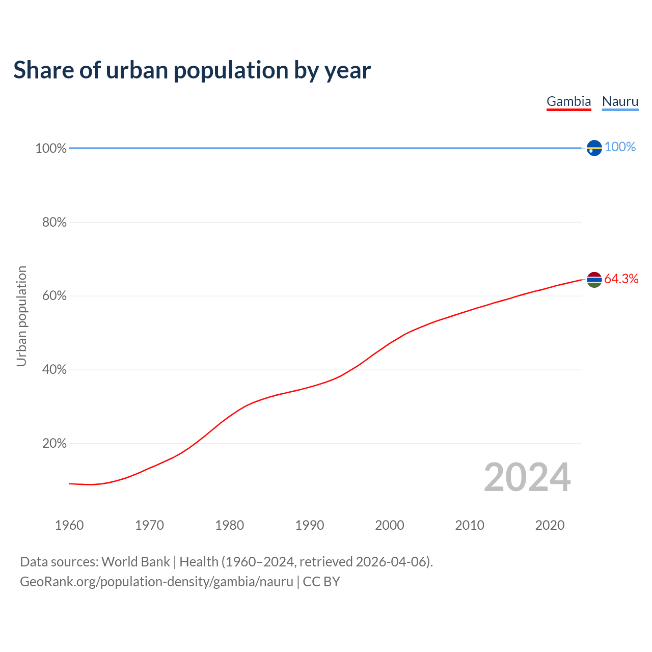 From 2004 to 2024, the share of urban population changed from 51.5% to 64.3% in the Gambia and from 100% to 100% in Nauru.