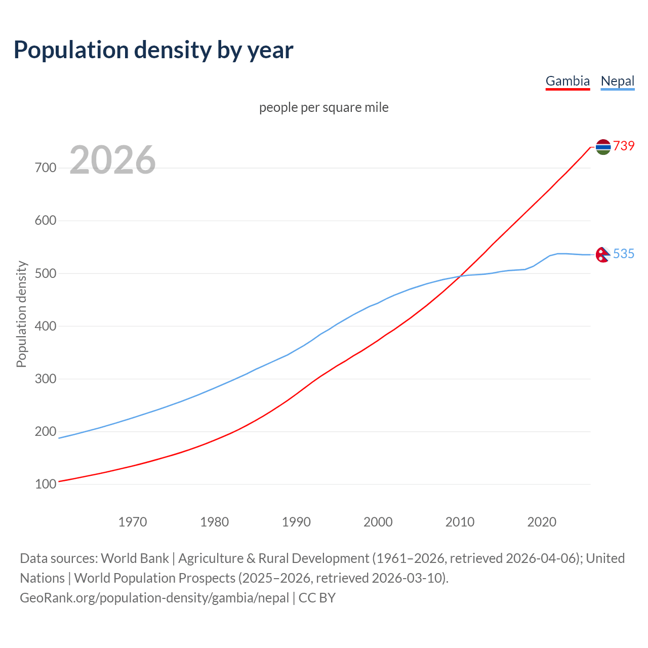 From 2006 to 2026, population density in the Gambia increased by 68.2%, compared to a 11.4% growth in Nepal.