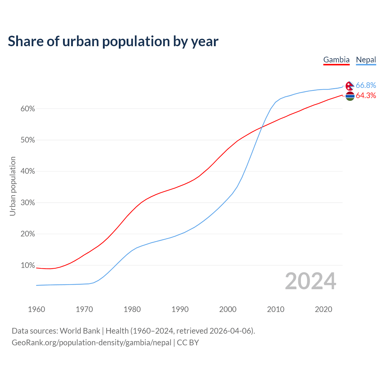 From 2004 to 2024, the share of urban population changed from 51.5% to 64.3% in the Gambia and from 41.6% to 66.8% in Nepal.