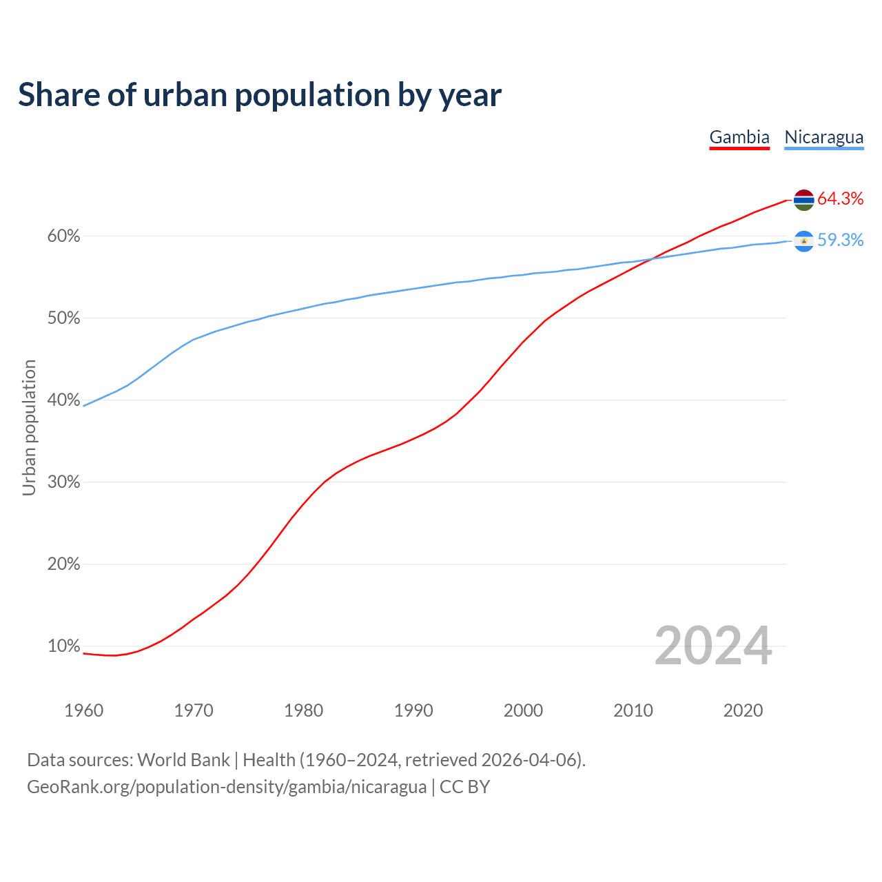 From 2004 to 2024, the share of urban population changed from 51.5% to 64.3% in the Gambia and from 55.8% to 59.3% in Nicaragua.