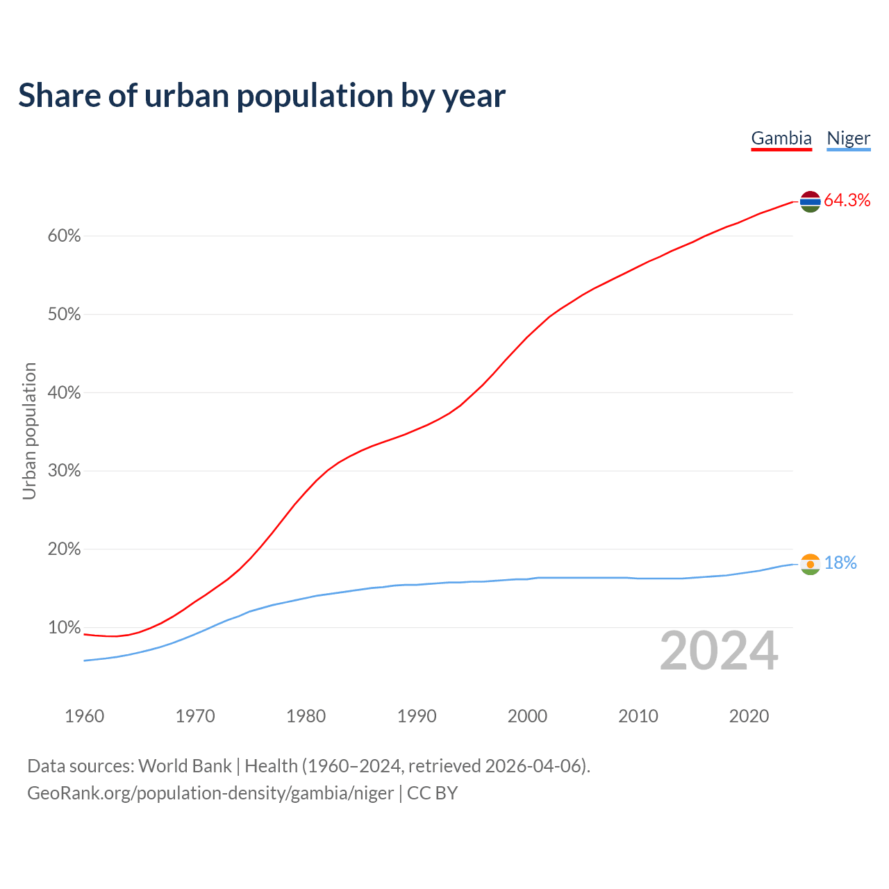 From 2004 to 2024, the share of urban population changed from 51.5% to 64.3% in the Gambia and from 16.3% to 18% in Niger.