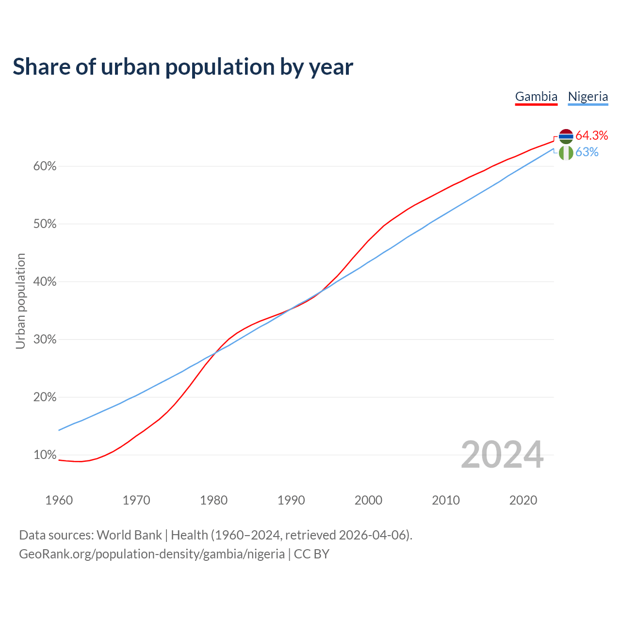 From 2004 to 2024, the share of urban population changed from 51.5% to 64.3% in the Gambia and from 46.7% to 63% in Nigeria.
