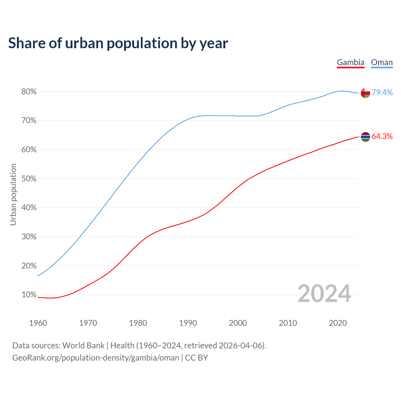 From 2004 to 2024, the share of urban population changed from 51.5% to 64.3% in the Gambia and from 71.5% to 79.4% in Oman.