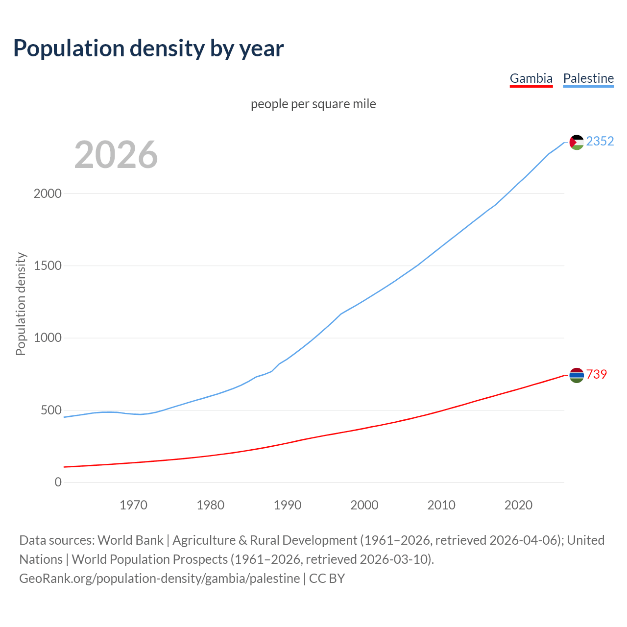 The Gambia has a population density of 739 people per square mile compared to 2,352 people in Palestine. The Gambia has 44,070 sq ft of land per person vs 12,251 sq ft in Palestine. The Gambia and Palestine rank 36th and 8th by population density, respectively.
