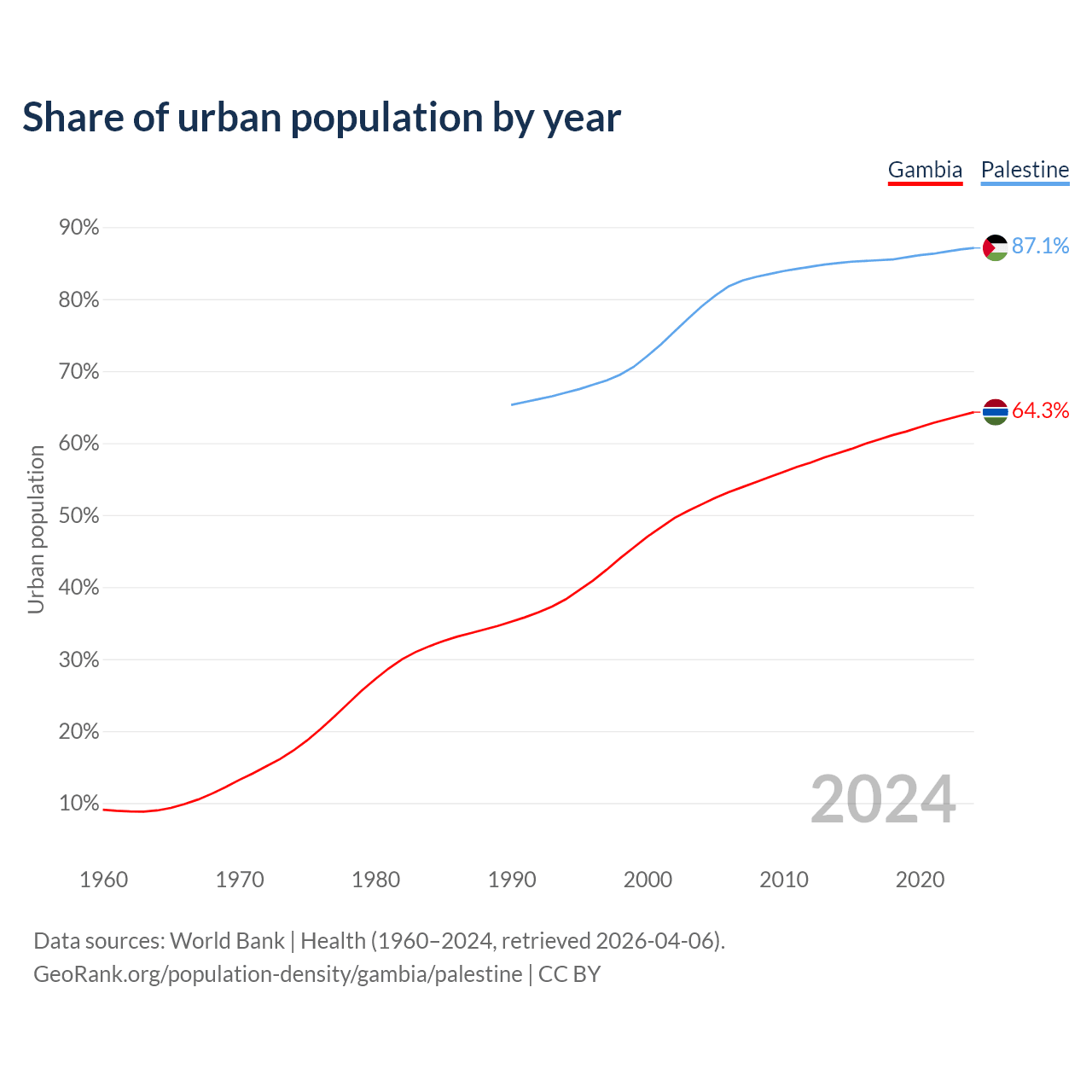 From 2004 to 2024, the share of urban population changed from 51.5% to 64.3% in the Gambia and from 79% to 87.1% in Palestine.